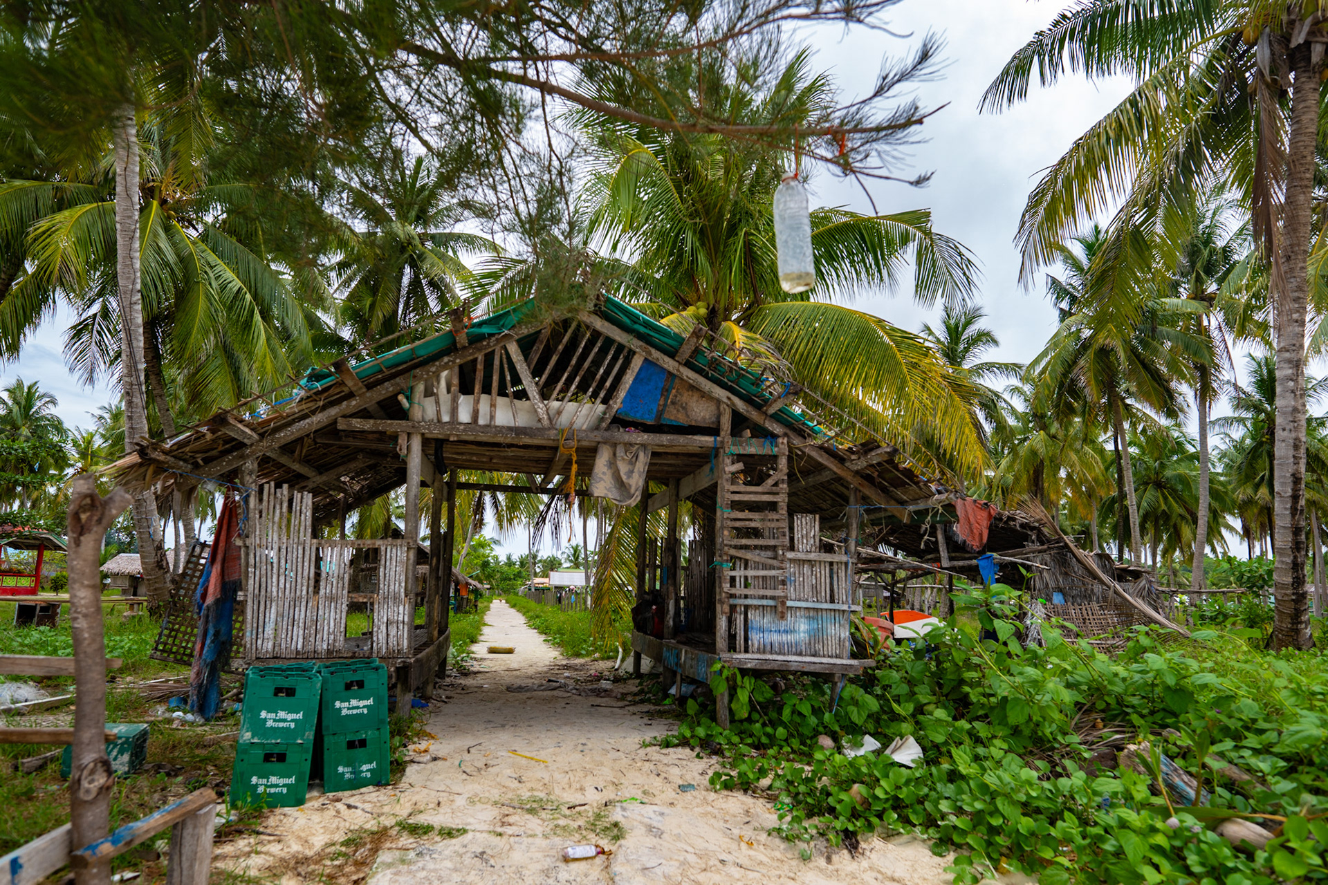 San Miguel Brewing crates stacked beside the village road. The $700+ million dollar San Miguel Corporation owns over 7,000 hectares on Bugsuk Island.